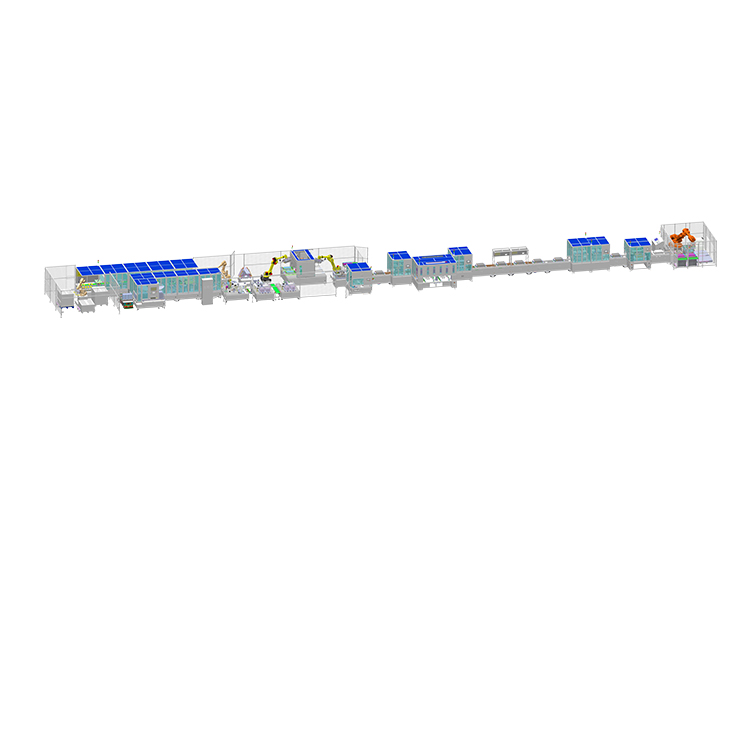 主要用于汽车动力软包动力MK线上平台模组的生产。通过智能AGV输送物料到指定位置,指定位置对物料实现自动抓取,从电芯-模块-模组组装过程均采用自动化组装。
